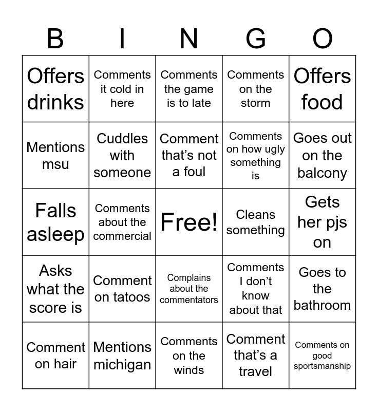 This bingo card has a free space and 24 words: Comment on hair, Comment on tatoos, Comment that’s not a foul, Comment that’s a travel, Offers food, Offers drinks, Comments it cold in here, Comments the game is to late, Cleans something, Gets her pjs on, Falls asleep, Cuddles with someone, Comments I don’t know about that, Goes to the bathroom, Mentions msu, Mentions michigan, Comments on the winds, Comments on the storm, Goes out on the balcony, Asks what the score is, Comments about the commercial, Complains about the commentators, Comments on how ugly something is and Comments on good sportsmanship.