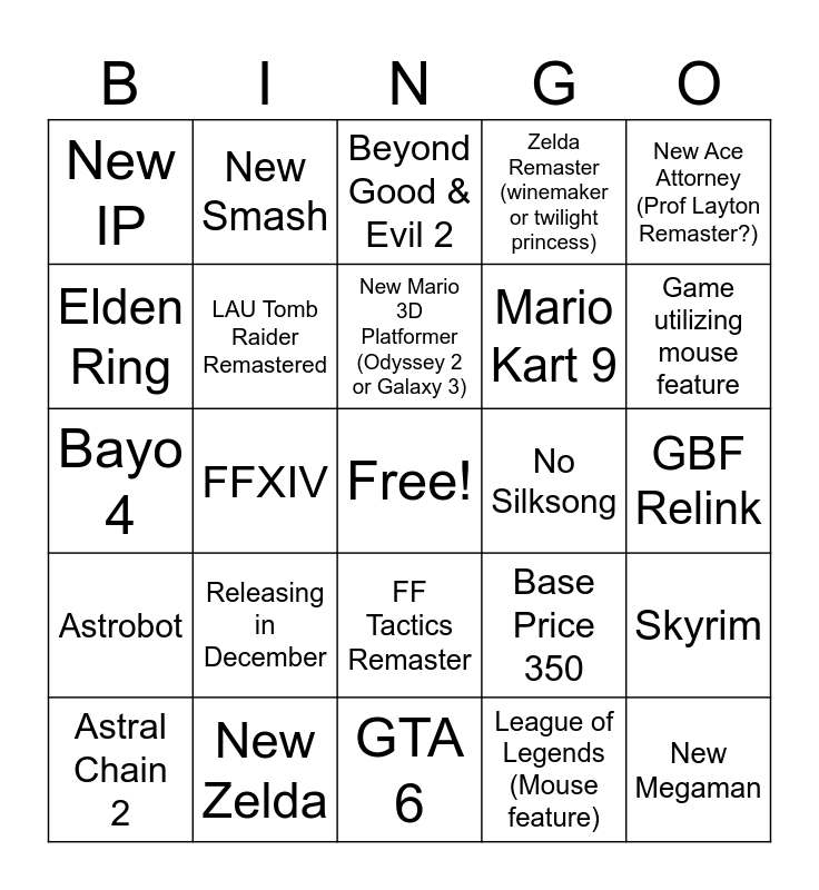 This bingo card has a free space and 24 words: Releasing in December, New Zelda, New Mario 3D Platformer (Odyssey 2 or Galaxy 3), Astral Chain 2, New Ace Attorney (Prof Layton Remaster?), New IP, Elden Ring, New Smash, No Silksong, FF Tactics Remaster, Mario Kart 9, Bayo 4, Base Price 350, Skyrim, LAU Tomb Raider Remastered, League of Legends (Mouse feature), GBF Relink, Beyond Good & Evil 2, Game utilizing mouse feature, FFXIV, New Megaman, Astrobot, Zelda Remaster (winemaker or twilight princess) and GTA 6.