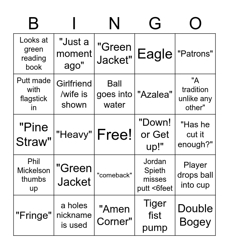 This bingo card has a free space and 29 words: "Fringe", Clip of Arnold Palmer, "Heavy", Club twirl, Looks at green reading book, "Green Jacket", Girlfriend /wife is shown, "Green Jacket, "Down! or Get up!", a holes nickname is used, "Has he cut it enough?", Double Bogey, "Amen Corner", Tiger fist pump, "A tradition unlike any other", Drop from the knees, "comeback", Phil Mickelson thumbs up, "Patrons", "Pine Straw", Jordan Spieth misses putt <6feet, "Hello Friends", "Azalea", Putt made with flagstick in, Eagle, "Just a moment ago", Player drops ball into cup, Ball goes into water and "Get in the hole!".
