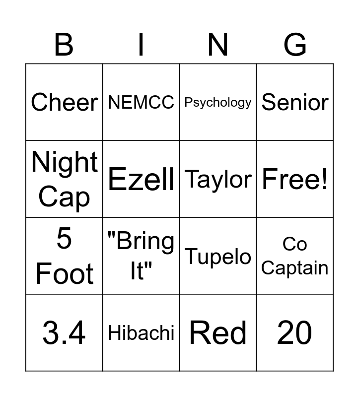 This bingo card has 18 words: "Bring It", 20, Psychology, Cheer, Tupelo, Senior, 3.4, NEMCC, Free!, 5 Foot, Red, Night Cap, Co Captain, Ezell, Taylor, Five Spots, Hibachi and Tarus.