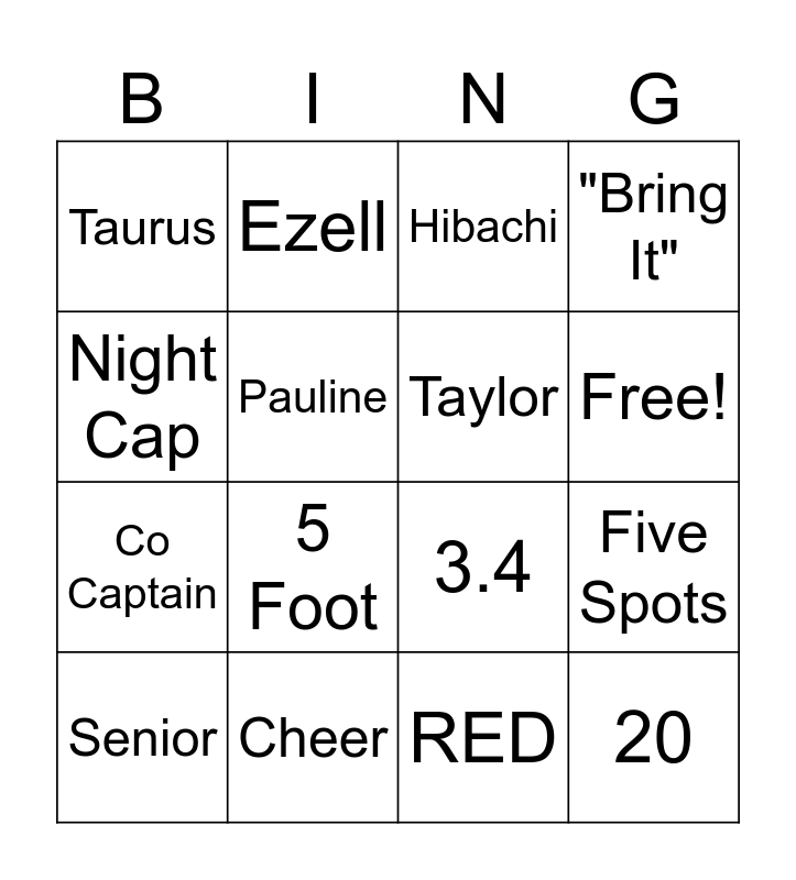 This bingo card has 17 words: RED, Senior, Hibachi, Taurus, 5 Foot, "Bring It", Five Spots, Taylor, Free!, Pauline, Cheer, 3.4, Night Cap, Ezell, Co Captain, NEMCC and 20.