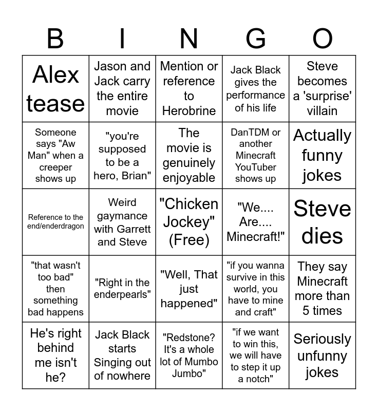 This bingo card has a free space and 29 words: He's right behind me isn't he?, Garrett dies, Weird gaymance with Garrett and Steve, Weird romance subplot, Alex tease, Mention or reference to Herobrine, "you're supposed to be a hero, Brian", "Right in the enderpearls", "We.... Are.... Minecraft!", Jack Black starts Singing out of nowhere, Steve dies, Seriously unfunny jokes, "Redstone? It's a whole lot of Mumbo Jumbo", "if we want to win this, we will have to step it up a notch", Actually funny jokes, Terrible CGI, "Well, That just happened", "that wasn't too bad" then something bad happens, Steve becomes a 'surprise' villain, Reference to the end/enderdragon, "if you wanna survive in this world, you have to mine and craft", AC/DC or GNR plays, DanTDM or another Minecraft YouTuber shows up, Someone says "Aw Man" when a creeper shows up, Jack Black gives the performance of his life, Jason and Jack carry the entire movie, They say Minecraft more than 5 times, The movie is genuinely enjoyable and Jack Black shouts every move he is going to make in the final fight.