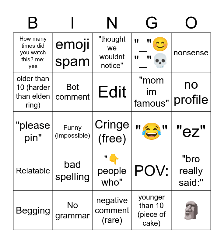 This bingo card has a free space and 24 words: bad spelling, No grammar, Edit, Begging, nonsense, How many times did you watch this? me: yes, older than 10 (harder than elden ring), emoji spam, "😂", "👇 people who", "mom im famous", "please pin", POV:, "bro really said:", Bot comment, younger than 10 (piece of cake), "ez", "thought we wouldnt notice", no profile, Funny (impossible), 🗿, Relatable, "_"😊 "_"💀 and negative comment (rare).