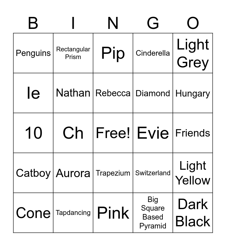 This bingo card has a free space and 336 words: Ar, Jen, Slovakia, 11, 12, Cube, 17, 26, Big Hexagon, Animal, Imagination, 10, Oa, Veichles, V, O, Katy, Sports, Mal, Sweden, Feelings, Leah, Happy, Jenny, Joanna, 42, Oo, Aurora, 28, Hayley, CK, Gonzo, Green, Big Cone, 8, Big Square Based Pyramid, Gekko, Purple, Amy, Animals, W, 14, Romania, Kings, Owlette, Owls, School, Estonia, Pink, Dark Teal, 41, 16, Croatia, 30, Jobs, Belle, Ue, Light Lime, Y, Alison, Light Yellow, Er, 36, Italy, 2, Derek, Kemi, Kite, Spain, Light Black, Kristoff, Snow White, Dark Blue, Ricky, Light Pink, Cat, Radzi, Moldova, Playground, Piggy, Styles of songs, 34, J, Olivia, 9, Big Triangular Prism, Square, Sita, Light Purple, Octagon, De'Graft, Serbia, Cinderella, Big Triangle, Ariel, Triangular Prism, 22, Dark Black, Rebecca, Tiana, Big Heart, Katie, Grey, Tapdancing, Musicals part 2, Dark Orange, Turkey, 37, F, Semi-circle, Ukraine, Ben S, Big Trapezium, Craig, Holly, FYR Macedonia, Orange, Sphere, Ireland, Austria, Magenta, Dark Brown, Sam and Mark, Senses, Marshall, Bulgaria, Hexagon, Light Green, David, Yellow, Rhys, Light Grey, 40, 32, Belarus, Karim, Shapes, Th, 3, Hungary, Rectangle, Blue, Ai, Hands, Games, Friends, 5, Or, Josie, Light Brown, Jay, 23, Cerrie, 39, Freddy, Everest, Denmark, G, Square Based Pyramid, U, Jazz, United Kingdom, Ch, Families, R, Ballet, Carlos, Ayshah, Ryan, Russia, Andy, S, Red, P, Dermot, X, E, Diamond, I, Light Blue, 20, Skye, Big Rectangle, Norway, D, Cowboys, Fozzie, Magenta, Dark Red, 18, Iceland, N, Alex W, Bosnia, Phonics, Musicals, France, 29, Dark Yellow, Nathan, Maleficent, Catboy, Th, Time and place, Albania, Elsa, H, M, Pirates, Big Decagon, Philip, Chase, Hans, Azerbaijan, San Marino, Light White, Oo, Big Parallelogram, Israel, L, 1, Big Square, Big Octogan, 33, Finland, Dressing up, Bodies, Dark White, Cars, 19, 31, Big Pentagon, Trapezium, Light Teal, Ben C, Ng, Ie, 13, Z, Georgia, Gaston, Switzerland, T, 27, Cuboid, KC, Big Circle, Decagon, Pip, Ryder, Emergencies, Circle, Black, Portugal, Evil Queen, Rubble, Latvia, Teal, Triangle, Opposites, Alex H, Naz, Kiera, 21, Shanequa, Big Sphere, Evie, 38, Oi, Pentagon, Maleficent, The Netherlands, Brown, 35, Greece, 15, Pretending, 6, Dark Purple, 24, Zuma, Dark Lime, Dark Green, Montenegro, Belgium, Kermit, Doctors and hospitals, Penguins, Slovenia, Sh, Qu, Space, Big Semi Circle, Ee, Martin, Big Cuboid, Lithuania, Heart, Anna, Cyprus, Musicals part 3, Merida, Cone, Numbers, Light Red, Maroon, Princes and princesses, White, A, Light Maroon, Big Rectangular Prism, Lime, 25, 4, Big Cube, Lauren, Colours, Parallelogram, Rapunzel, B, Alphabet, Evie, Cylinder, Ou, Christmas, Light Orange, Rocky, Big Cylinder, Malta, Summer, Germany, 7, Jasmine, Rectangular Prism, Ursula and Light Blue.