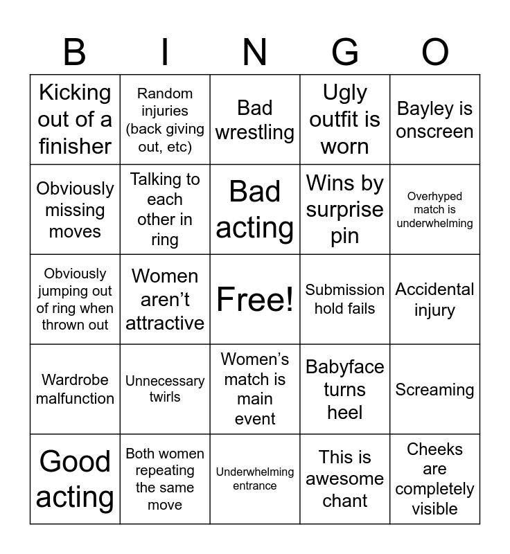 This bingo card has a free space and 24 words: Unnecessary twirls, Both women repeating the same move, Bad acting, Good acting, Bayley is onscreen, Kicking out of a finisher, Obviously missing moves, Random injuries (back giving out, etc), Submission hold fails, Women’s match is main event, Wins by surprise pin, Obviously jumping out of ring when thrown out, Babyface turns heel, Screaming, Talking to each other in ring, This is awesome chant, Accidental injury, Bad wrestling, Overhyped match is underwhelming, Women aren’t attractive, Cheeks are completely visible, Wardrobe malfunction, Ugly outfit is worn and Underwhelming entrance.