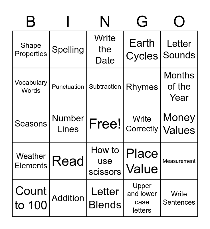 This bingo card has a free space and 24 words: Read, Addition, Subtraction, Count to 100, Letter Sounds, Shape Properties, Vocabulary Words, Spelling, Write Correctly, How to use scissors, Rhymes, Seasons, Place Value, Measurement, Punctuation, Upper and lower case letters, Money Values, Write the Date, Months of the Year, Number Lines, Write Sentences, Weather Elements, Earth Cycles and Letter Blends.