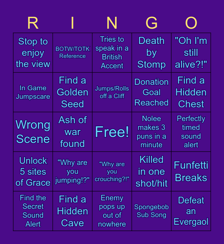 This bingo card has a free space and 39 words: BOTW/TOTK Reference, Falls off a Cliff, Defeat a Boss (No Summons), Find a Golden Seed, Find the Secret Sound Alert, "Why are you crouching?!", Jumps/Rolls off a Cliff, Kill an enemy group without looking, "Oh I'm still alive?!", Unlock 5 sites of Grace, Ash of war found, Death by Stomp, Defeat an Evergaol, Perfectly timed sound alert, Nolee makes 3 puns in a minute, "Why are you jumping!?", 69 deaths, Stop to enjoy the view, Beat an enemy on horseback, Killed in one shot/hit, In Game Jumpscare, Enemy pops up out of nowhere, Donation Goal Reached, Find a Hidden Chest, Kill a Troll, Death by bloodloss, Nolee starts a story and doesn't finish it, Total Donation Goal Reached, Defeat a boss on first try, BOTW/TOTK Reference, Complete an NPC Quest, Coconut Jerry Summoned, Tries to speak in a British Accent, Find a Hidden Cave, Spongebob Sub Song, $69 donation, Funfetti Breaks, Wrong Scene and Reach 1000 puns.
