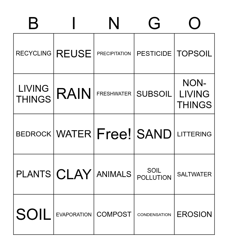 This bingo card has a free space and 29 words: SOIL, AIR, WATER, AIR POLLUTION, RECYCLING, PRECIPITATION, RAIN, CLAY, SAND, EVAPORATION, LITTERING, EROSION, COMPOST, CONDENSATION, NON-LIVING THINGS, WATER POLLUTION, ANIMALS, PLANTS, TOPSOIL, BEDROCK, SOIL POLLUTION, COLLECTION, SUBSOIL, LIVING THINGS, PESTICIDE, REUSE, SALTWATER, FRESHWATER and DECOMPOSE.