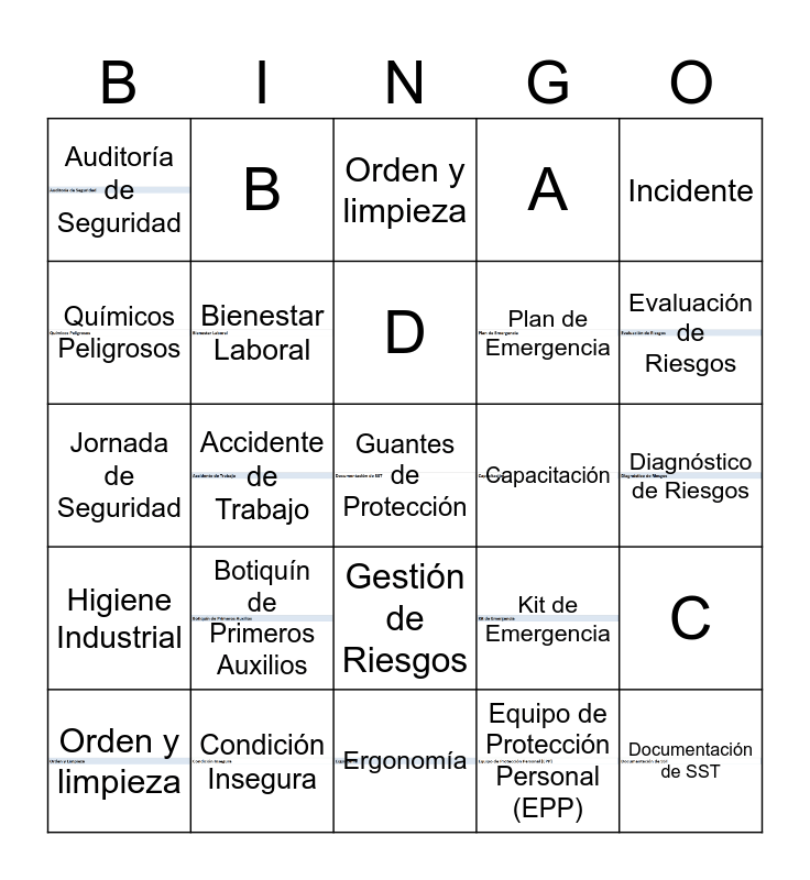 This bingo card has 19 images, a free space and 29 words: Orden y limpieza, Comité de Seguridad y Salud en el Trabajo (CSST), Accidente de Trabajo, Almacén Seguro, Auditoría de Seguridad, Orden y limpieza, Bienestar Laboral, Botiquín de Primeros Auxilios, Capacitación, Condición Insegura, Diagnóstico de Riesgos, Documentación de SST, Ergonomía, Equipo de Protección Personal (EPP), Evaluación de Riesgos, Formación Continua, Gestión de Riesgos, Higiene Industrial, Incidente, Jornada de Seguridad, Kit de Emergencia, Liderazgo en SST, Plan de Emergencia, Químicos Peligrosos, A, B, C, D and E.