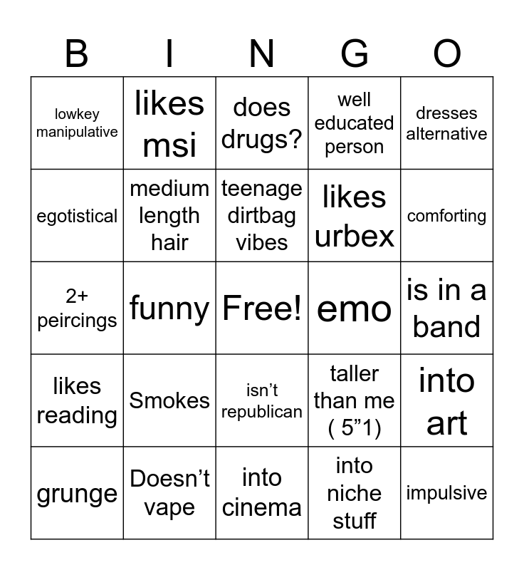 This bingo card has a free space and 24 words: Smokes, Doesn’t vape, teenage dirtbag vibes, grunge, dresses alternative, lowkey manipulative, egotistical, likes msi, emo, isn’t republican, likes urbex, 2+ peircings, taller than me ( 5”1), into art, medium length hair, into niche stuff, is in a band, does drugs?, comforting, funny, impulsive, likes reading, well educated person and into cinema.