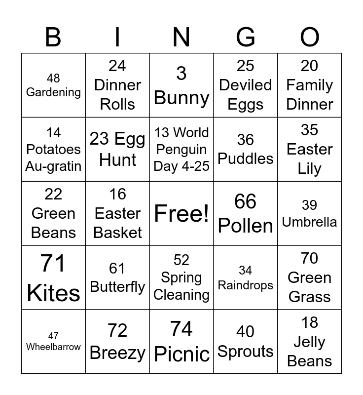 This bingo card has a free space and 75 words: 1 April Showers, 2 Easter, 3 Bunny, 4 Good Friday, 5 April Fools Day, 6 Passover, 7 Palm Sunday, 8 Tax Day, 9 Easter Monday, 10 Earth Day, 11 National Tea Day 4-21, 12 National Unicorn Day 4-9, 13 World Penguin Day 4-25, 14 Potatoes Au-gratin, 15 Leg of Lamb, 16 Easter Basket, 17 Chocolate Bunnies, 18 Jelly Beans, 19 Colored Eggs, 20 Family Dinner, 21 Glazed Ham, 22 Green Beans, 23 Egg Hunt, 24 Dinner Rolls, 25 Deviled Eggs, 26 Hot Cross Buns, 27 Asparagus, 28 Carrot Cake, 29 Honey Glazed Carrots, 30 Creamed Peas, 31 Chicks, 32 Ducklings, 33 Eggs, 34 Raindrops, 35 Easter Lily, 36 Puddles, 37 Bees, 38 Birds, 39 Umbrella, 40 Sprouts, 41 Sunshine, 42 Raincoat, 43 Spring, 44 Bonnet, 45 Parade, 46 Watering Can, 47 Wheelbarrow, 48 Gardening, 49 Plants, 50 Seeds, 51 Spring Break, 52 Spring Cleaning, 53 Blossoms, 54 Migration, 55 Nest, 56 Lamb, 57 Rainbow, 58 Frog, 59 Tadpoles, 60 Robins, 61 Butterfly, 62 Tulips, 63 Daffodils, 64 Cherry Blossoms, 65 Crocus, 66 Pollen, 67 Compost, 68 Jasmine, 69 Warmer Weather, 70 Green Grass, 71 Kites, 72 Breezy, 73 Rabbit, 74 Picnic and 75 Plant Nursery.
