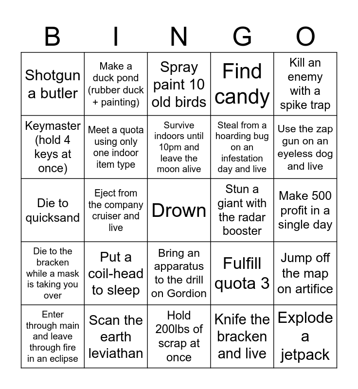 This bingo card has a free space and 24 words: Put a coil-head to sleep, Scan the earth leviathan, Survive indoors until 10pm and leave the moon alive, Enter through main and leave through fire in an eclipse, Kill an enemy with a spike trap, Shotgun a butler, Keymaster (hold 4 keys at once), Make a duck pond (rubber duck + painting), Stun a giant with the radar booster, Bring an apparatus to the drill on Gordion, Steal from a hoarding bug on an infestation day and live, Die to quicksand, Fulfill quota 3, Jump off the map on artifice, Meet a quota using only one indoor item type, Knife the bracken and live, Make 500 profit in a single day, Spray paint 10 old birds, Use the zap gun on an eyeless dog and live, Eject from the company cruiser and live, Explode a jetpack, Die to the bracken while a mask is taking you over, Find candy and Hold 200lbs of scrap at once.