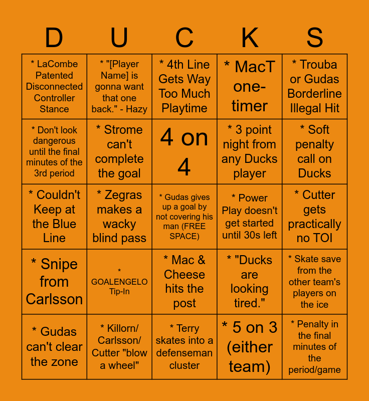 This bingo card has a free space and 30 words: * Killorn/ Carlsson/ Cutter "blow a wheel", *Strome or Vatrano take an unnecessary penalty, * Zegras makes a wacky blind pass, * A Zegras blind pass actually works out, * LaCombe Patented Disconnected Controller Stance, * 4th Line Gets Way Too Much Playtime, * Strome can't complete the goal, * Mac & Cheese hits the post, * Power Play doesn't get started until 30s left, * Terry skates into a defenseman cluster, * Cutter gets practically no TOI, * Penalty in the final minutes of the period/game, * 5 on 3 (either team), * Missed penalty call on other team, * Soft penalty call on Ducks, * "Good shift from the Ducks.", * "Ducks are looking tired.", * Snipe from Carlsson, * GOALENGELO Tip-In, * Trouba or Gudas Borderline Illegal Hit, * Couldn't Keep at the Blue Line, * Insane Save by Our Goalie, * "[Player Name] is gonna want that one back." - Hazy, * 3 point night from any Ducks player, * Don't look dangerous until the final minutes of the 3rd period, * MacT one-timer, * Skate save from the other team's players on the ice, * Gudas can't clear the zone, 4 on 4 and 4 min penalty.