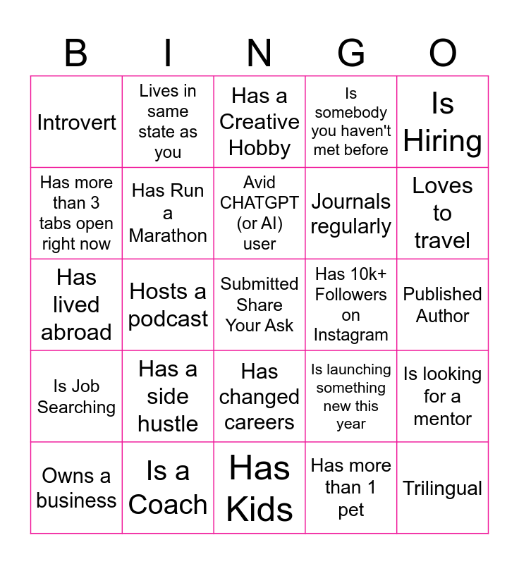 This bingo card has a free space and 29 words: Owns a business, New Job This Year, Hosts a podcast, Bilingual, Introvert, Has a Creative Hobby, Has Run a Marathon, Has a side hustle, Has 10k+ Followers on Instagram, Is a Coach, Published Author, Trilingual, Has Kids, Has more than 1 pet, Loves to travel, Has a Vacation Coming Up, Has changed careers, Is Job Searching, Is Hiring, Has lived abroad, Is launching something new this year, Has a vision board, Journals regularly, Has more than 3 tabs open right now, Is somebody you haven't met before, Lives in same state as you, Is looking for a mentor, Avid CHATGPT (or AI) user and Has a LinkedIN Newsletter.