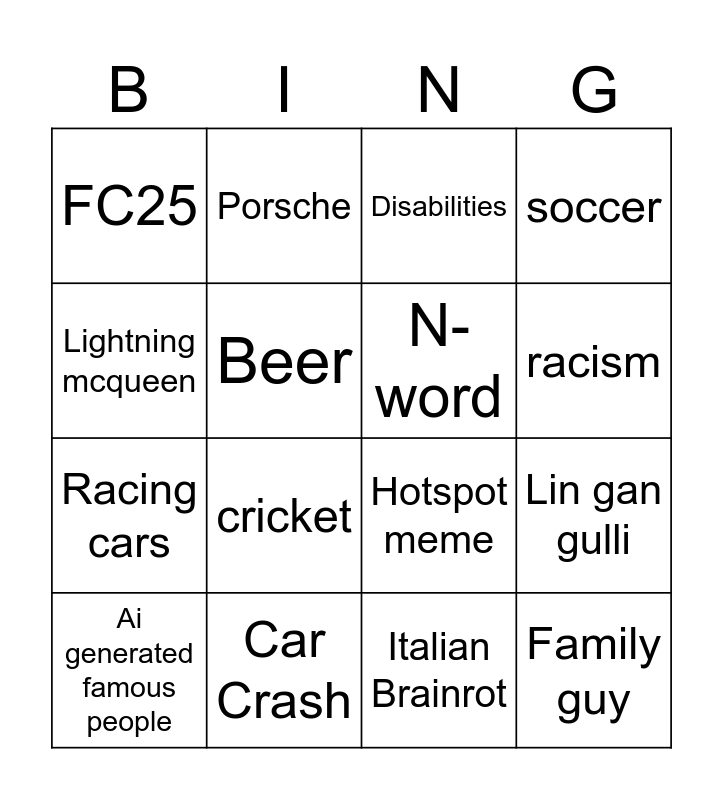 This bingo card has 16 words: Car Crash, Lin gan gulli, Disabilities, FC25, Racing cars, Porsche, Hotspot meme, Italian Brainrot, Lightning mcqueen, Beer, Ai generated famous people, soccer, cricket, racism, N-word and Family guy.
