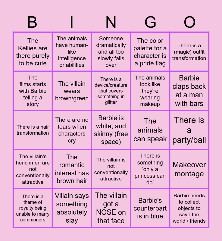 This bingo card has a free space and 24 words: The romantic interest has brown hair, Villain says something absolutely slay, There is a device/creature that covers something in glitter, There is a theme of royalty being unable to marry commoners, There is a (magic) outfit transformation, The Kellies are there purely to be cute, The films starts with Barbie telling a story, The animals have human-like intelligence or abilities, The animals can speak, The villain is not conventionally attractive, The animals look like they're wearing makeup, There is a hair transformation, There is something ‘only a princess can do’, Makeover montage, The villain wears brown/green, Barbie's counterpart is in blue, There is a party/ball, Someone dramatically and all too slowly falls over, Barbie claps back at a man with bars, There are no tears when characters cry, Barbie needs to collect objects to save the world / friends, The villain's henchmen are not conventionally attractive, The color palette for a character is a pride flag and The villain got a NOSE on that face.