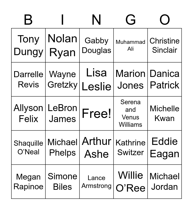 This bingo card has a free space and 24 words: Michael Phelps, Simone Biles, Lisa Leslie, Megan Rapinoe, Christine Sinclair, Tony Dungy, Darrelle Revis, Nolan Ryan, Serena and Venus Williams, Arthur Ashe, Marion Jones, Allyson Felix, Kathrine Switzer, Eddie Eagan, Wayne Gretzky, Willie O’Ree, Michelle Kwan, Gabby Douglas, Danica Patrick, LeBron James, Michael Jordan, Shaquille O’Neal, Muhammad Ali and Lance Armstrong.