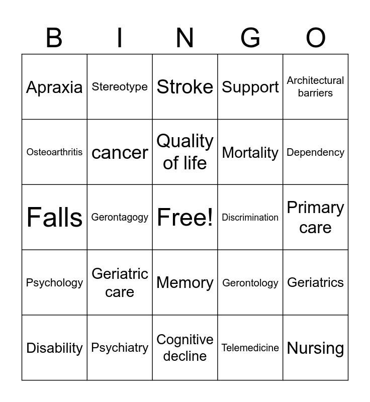 This bingo card has a free space and 78 words: Abandonment, Accessibility, Stroke, Companionship, Attitude, Activities of Daily Living, Instrumental Activities of Daily Living, Aphasia, Agnosia, Agraphia, Amnesia, Anxiety, Support, Apraxia, Arthritis, Osteoarthritis, Home care, Geriatric care, Social and healthcare assistance, Primary care, Autonomy, Architectural barriers, Falls, Quality of life, cancer, Life center, caregivers, Palliative care, Impairment, Dementia, Dependency, Depression, Cognitive decline, Diabetes, Disability, Discrimination, Ageism, Education, Disease, Nursing, Aging, Active aging, Healthy aging, Epidemiology, Life expectancy, Stereotype, Euthanasia, Risk factor, Pharmacology, Frailty, Geriatrics, Gerontagogy, Gerontology, Hospital, Retirement, Longevity, Physical abuse, Medications, Medicine, Memory, Mortality, Negligence, Neurology, Nutrition, Osteoporosis, Parkinson’s disease, Pensions, Elderly people, Psychology, Psychiatry, Social resources, Rehabilitation, Intergenerational relationships, Loneliness, Telemedicine, Mental disorders, Long-term care units and Old age.