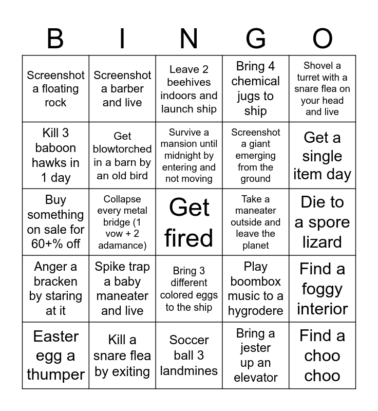 This bingo card has a free space and 24 words: Spike trap a baby maneater and live, Kill a snare flea by exiting, Survive a mansion until midnight by entering and not moving, Easter egg a thumper, Shovel a turret with a snare flea on your head and live, Screenshot a floating rock, Kill 3 baboon hawks in 1 day, Screenshot a barber and live, Take a maneater outside and leave the planet, Bring 3 different colored eggs to the ship, Screenshot a giant emerging from the ground, Buy something on sale for 60+% off, Play boombox music to a hygrodere, Find a foggy interior, Get blowtorched in a barn by an old bird, Bring a jester up an elevator, Die to a spore lizard, Leave 2 beehives indoors and launch ship, Get a single item day, Collapse every metal bridge (1 vow + 2 adamance), Find a choo choo, Anger a bracken by staring at it, Bring 4 chemical jugs to ship and Soccer ball 3 landmines.