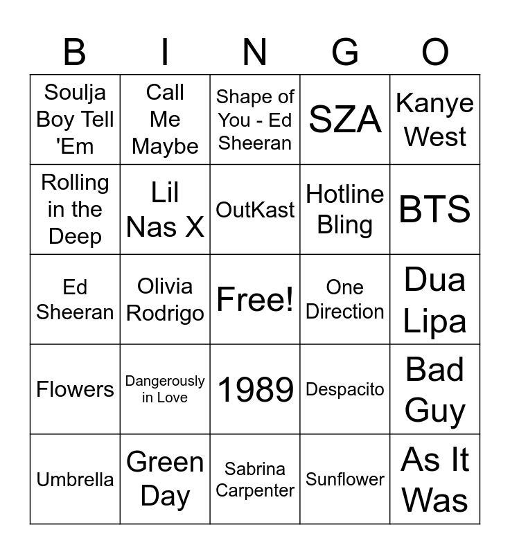 This bingo card has a free space and 24 words: Dangerously in Love, Green Day, OutKast, Umbrella, Kanye West, Soulja Boy Tell 'Em, Rolling in the Deep, Call Me Maybe, One Direction, 1989, Hotline Bling, Ed Sheeran, Despacito, Bad Guy, Lil Nas X, Sunflower, Dua Lipa, Shape of You - Ed Sheeran, BTS, Olivia Rodrigo, As It Was, Flowers, SZA and Sabrina Carpenter.