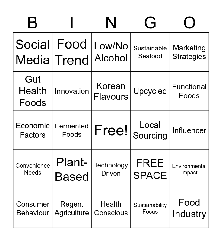 This bingo card has a free space and 25 words: Plant-Based, Health Conscious, Korean Flavours, Consumer Behaviour, Marketing Strategies, Social Media, Gut Health Foods, Food Trend, Local Sourcing, Technology Driven, Upcycled, Economic Factors, FREE SPACE, Environmental Impact, Innovation, Ethical Concerns, Influencer, Low/No Alcohol, Functional Foods, Fermented Foods, Food Industry, Regen. Agriculture, Convenience Needs, Sustainable Seafood and Sustainability Focus.