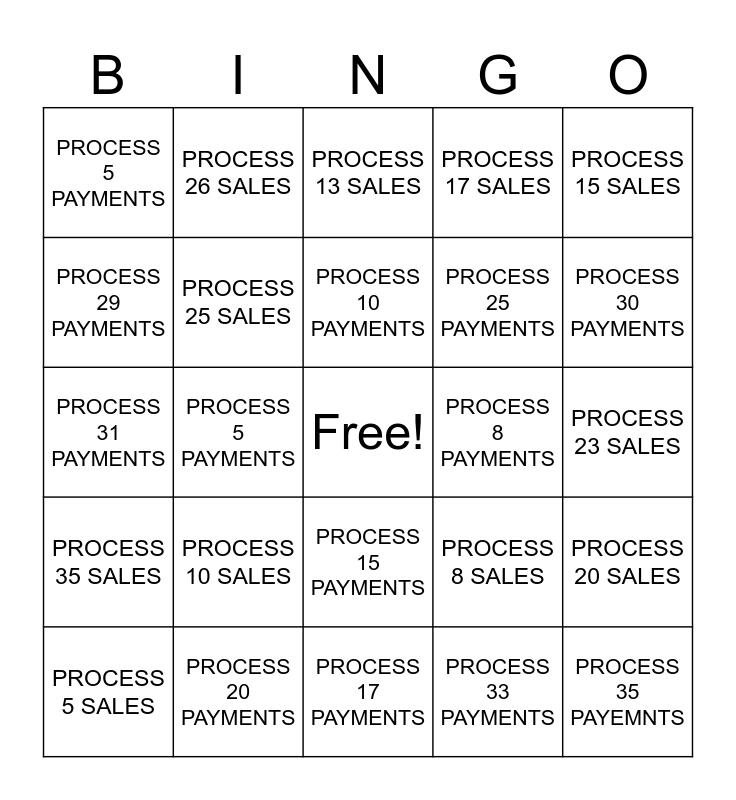 This bingo card has a free space and 24 words: PROCESS 10 SALES, PROCESS 20 PAYMENTS, PROCESS 10 PAYMENTS, PROCESS 5 SALES, PROCESS 15 SALES, PROCESS 5 PAYMENTS, PROCESS 29 PAYMENTS, PROCESS 26 SALES, PROCESS 8 PAYMENTS, PROCESS 15 PAYMENTS, PROCESS 25 PAYMENTS, PROCESS 31 PAYMENTS, PROCESS 8 SALES, PROCESS 20 SALES, PROCESS 25 SALES, PROCESS 33 PAYMENTS, PROCESS 23 SALES, PROCESS 13 SALES, PROCESS 30 PAYMENTS, PROCESS 5 PAYMENTS, PROCESS 35 PAYEMNTS, PROCESS 35 SALES, PROCESS 17 SALES and PROCESS 17 PAYMENTS.