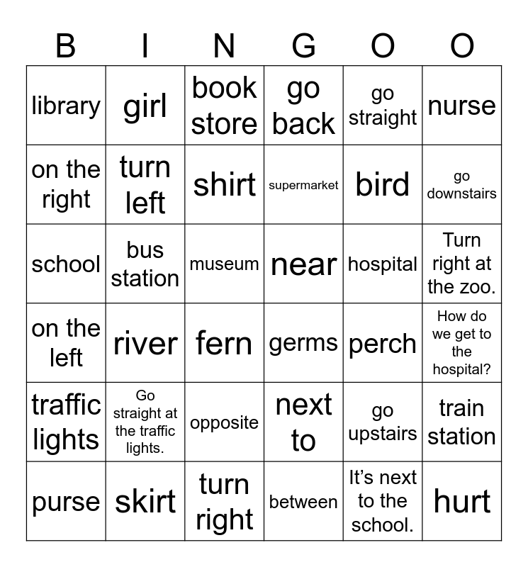This bingo card has 36 words: next to, opposite, between, on the right, on the left, near, turn left, turn right, go straight, go upstairs, go downstairs, go back, train station, bus station, supermarket, library, traffic lights, hospital, school, book store, museum, river, germs, fern, perch, girl, bird, skirt, shirt, nurse, hurt, purse, How do we get to the hospital?, Turn right at the zoo., Go straight at the traffic lights. and It’s next to the school..