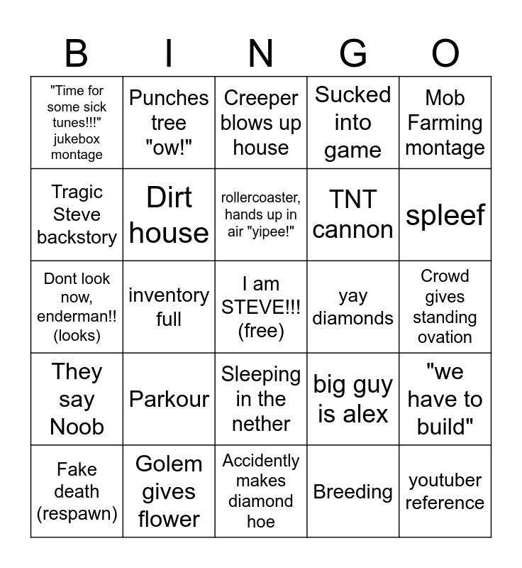 This bingo card has a free space and 34 words: Jeb_ or Dinnerbone, Breeding, Steve complains about bad trades, Griefing, They say Noob, Dirt house, Mob Farming montage, Fake death (respawn), Punches tree "ow!", Made up enchantments, rollercoaster, hands up in air "yipee!", Creeper blows up house, Herobrine, Potion brewing, yay diamonds, spleef, Golem gives flower, Dont look now, enderman!! (looks), Parkour, big guy is alex, Sleeping in the nether, cake, "Time for some sick tunes!!!" jukebox montage, Crowd gives standing ovation, Accidently makes diamond hoe, youtuber reference, Sucked into game, Dog dies, big emotional moment, TNT cannon, Tragic Steve backstory, Athlete Steve, inventory full, "we have to build" and villager says "Hmmmm".