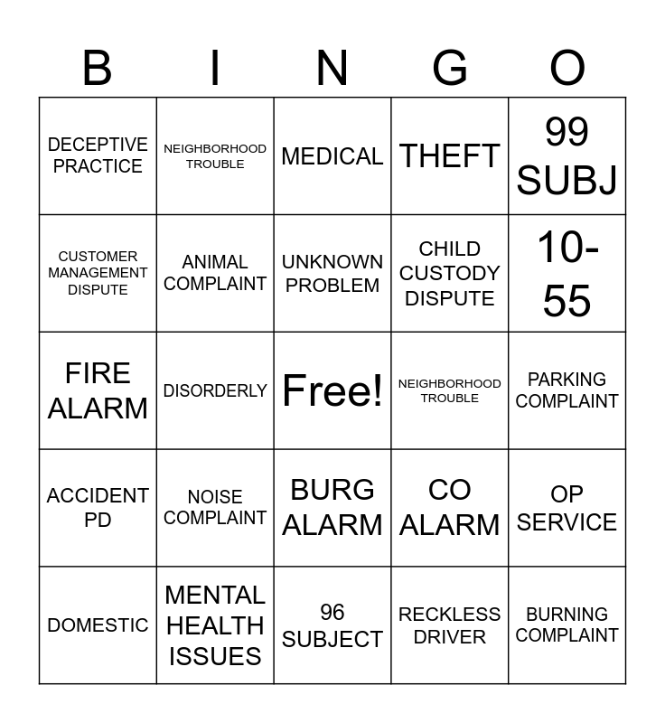 This bingo card has a free space and 29 words: DOMESTIC, LIFT ASSIST, DISORDERLY, WELFARE CHECK, DECEPTIVE PRACTICE, MEDICAL, ANIMAL COMPLAINT, NOISE COMPLAINT, NEIGHBORHOOD TROUBLE, MENTAL HEALTH ISSUES, PARKING COMPLAINT, BURNING COMPLAINT, 96 SUBJECT, RECKLESS DRIVER, 10-55, JUVENILE PROBLEM, BURG ALARM, ACCIDENT PD, 99 SUBJ, FIRE ALARM, CO ALARM, WIRES DOWN, CHILD CUSTODY DISPUTE, CUSTOMER MANAGEMENT DISPUTE, THEFT, NEIGHBORHOOD TROUBLE, OP SERVICE, UNKNOWN PROBLEM and 911 HANG UP.