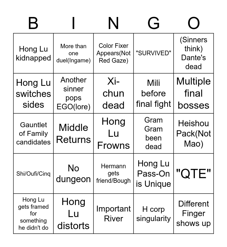 This bingo card has a free space and 24 words: No dungeon, Hong Lu distorts, Xi-chun dead, Hong Lu gets framed for something he didn't do, (Sinners think) Dante's dead, Hong Lu kidnapped, Hong Lu switches sides, More than one duel(Ingame), Gram Gram been dead, Hermann gets friend/Bough, Mili before final fight, Gauntlet of Family candidates, Hong Lu Pass-On is Unique, "QTE", Another sinner pops EGO(lore), H corp singularity, Heishou Pack(Not Mao), Color Fixer Appears(Not Red Gaze), Multiple final bosses, Middle Returns, Different Finger shows up, Shi/Oufi/Cinq, "SURVIVED" and Important River.