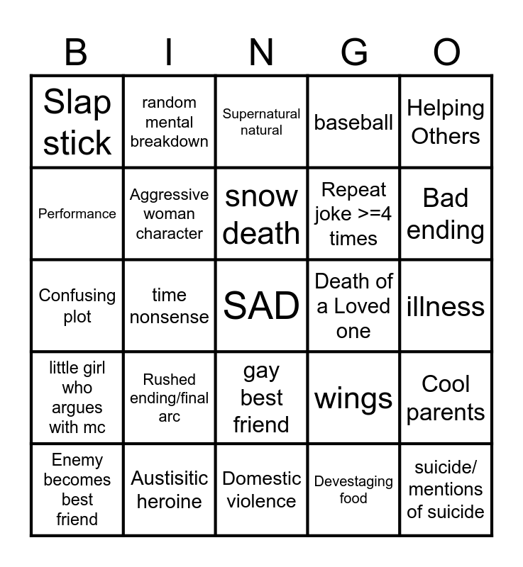 This bingo card has a free space and 24 words: Rushed ending/final arc, Austisitic heroine, snow death, Enemy becomes best friend, Helping Others, Slap stick, Performance, random mental breakdown, Death of a Loved one, gay best friend, Repeat joke >=4 times, Confusing plot, wings, Cool parents, Aggressive woman character, Devestaging food, illness, Supernatural natural, Bad ending, time nonsense, suicide/ mentions of suicide, little girl who argues with mc, baseball and Domestic violence.