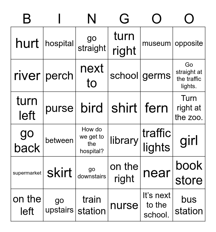 This bingo card has 36 words: on the right, go downstairs, nurse, river, go back, shirt, perch, train station, museum, near, Go straight at the traffic lights., turn right, book store, purse, school, hurt, supermarket, fern, turn left, go straight, bird, between, library, How do we get to the hospital?, traffic lights, hospital, germs, go upstairs, next to, opposite, bus station, on the left, girl, Turn right at the zoo., skirt and It’s next to the school..