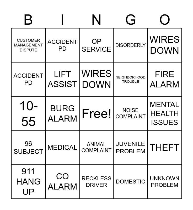 This bingo card has a free space and 29 words: 911 HANG UP, BURNING COMPLAINT, BURG ALARM, PARKING COMPLAINT, CUSTOMER MANAGEMENT DISPUTE, OP SERVICE, LIFT ASSIST, MEDICAL, NOISE COMPLAINT, CO ALARM, MENTAL HEALTH ISSUES, UNKNOWN PROBLEM, RECKLESS DRIVER, DOMESTIC, FIRE ALARM, CHILD CUSTODY DISPUTE, ANIMAL COMPLAINT, 96 SUBJECT, WIRES DOWN, 10-55, JUVENILE PROBLEM, WELFARE CHECK, NEIGHBORHOOD TROUBLE, ACCIDENT PD, DISORDERLY, ACCIDENT PD, THEFT, WIRES DOWN and 99 SUBJ.
