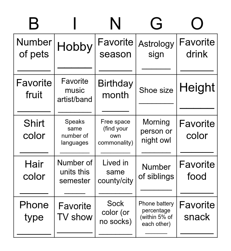 This bingo card has a free space and 24 words: Number of units this semester _____, Favorite TV show _______, Birthday month _____, Phone type ______, Favorite drink ______, Number of pets ______, Favorite fruit ______, Hobby _____, Morning person or night owl _______, Lived in same county/city ________, Shoe size ________, Shirt color _____, Number of siblings _______, Favorite food ______, Favorite music artist/band ________, Phone battery percentage (within 5% of each other) _______, Favorite color ______, Favorite season ______, Height _____, Speaks same number of languages _________, Favorite snack ______, Hair color _____, Astrology sign ______ and Sock color (or no socks) ________.