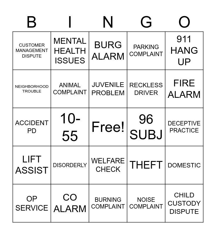This bingo card has a free space and 24 words: DISORDERLY, CO ALARM, JUVENILE PROBLEM, OP SERVICE, 911 HANG UP, CUSTOMER MANAGEMENT DISPUTE, NEIGHBORHOOD TROUBLE, MENTAL HEALTH ISSUES, 96 SUBJ, WELFARE CHECK, RECKLESS DRIVER, ACCIDENT PD, THEFT, DOMESTIC, ANIMAL COMPLAINT, NOISE COMPLAINT, DECEPTIVE PRACTICE, BURG ALARM, FIRE ALARM, 10-55, CHILD CUSTODY DISPUTE, LIFT ASSIST, PARKING COMPLAINT and BURNING COMPLAINT.