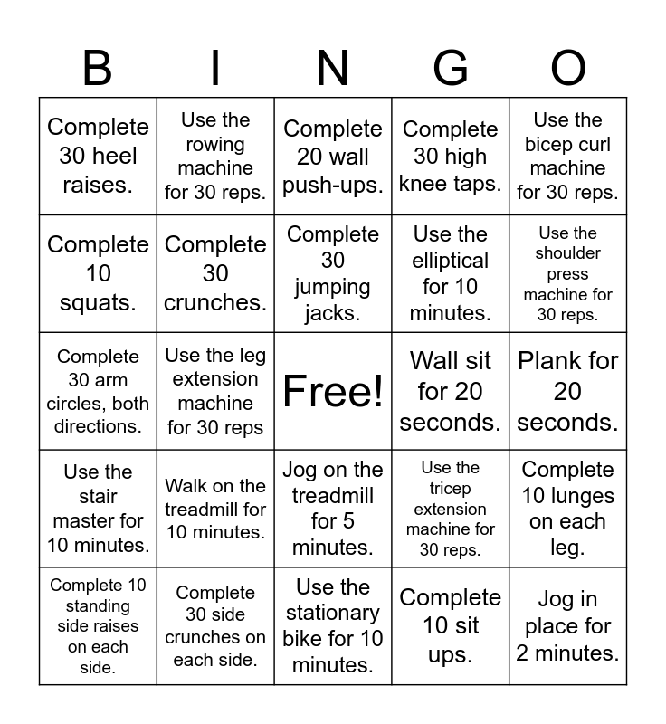This bingo card has a free space and 24 words: Walk on the treadmill for 10 minutes., Complete 30 side crunches on each side., Complete 30 jumping jacks., Complete 10 standing side raises on each side., Use the bicep curl machine for 30 reps., Complete 30 heel raises., Complete 10 squats., Use the rowing machine for 30 reps., Wall sit for 20 seconds., Jog on the treadmill for 5 minutes., Use the elliptical for 10 minutes., Complete 30 arm circles, both directions., Use the tricep extension machine for 30 reps., Complete 10 lunges on each leg., Complete 30 crunches., Complete 10 sit ups., Plank for 20 seconds., Complete 20 wall push-ups., Use the shoulder press machine for 30 reps., Use the leg extension machine for 30 reps, Jog in place for 2 minutes., Use the stair master for 10 minutes., Complete 30 high knee taps. and Use the stationary bike for 10 minutes..