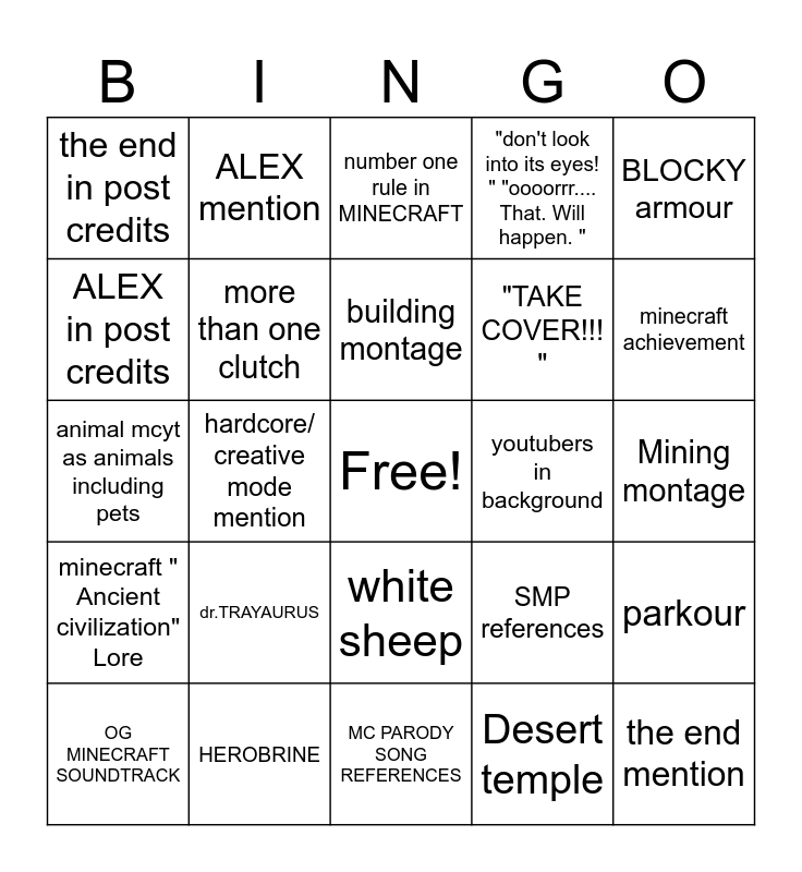 This bingo card has a free space and 24 words: dr.TRAYAURUS, HEROBRINE, building montage, OG MINECRAFT SOUNDTRACK, BLOCKY armour, the end in post credits, ALEX in post credits, ALEX mention, youtubers in background, white sheep, "TAKE COVER!!! ", animal mcyt as animals including pets, SMP references, parkour, more than one clutch, Desert temple, Mining montage, number one rule in MINECRAFT, minecraft achievement, hardcore/ creative mode mention, the end mention, minecraft " Ancient civilization" Lore, "don't look into its eyes! " "oooorrr.... That. Will happen. " and MC PARODY SONG REFERENCES.