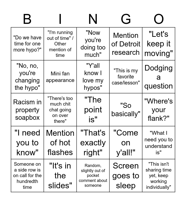 This bingo card has a free space and 28 words: "What I need you to understand is", "This is the main thing", "This is my favorite case/lesson", Screen goes to sleep, "No, no, you're changing the hypo", "Now you're doing too much", "I'm running out of time" / Other mention of time, "I need you to know", "So basically", Someone on a side row is on call for the hundredth time, Racism in property soapbox, Mention of Detroit research, "It's in the slides", Random, slightly out of pocket comment about someone, Dodging a question, "We have a lot to get through today", Mention of hot flashes, Mini fan appearance, "Y'all know I love my hypos", "That's exactly right", "Do we have time for one more hypo?", "It's not in your notes" / "Critically think with me", "This isn't sharing time yet, keep working individually", "There's too much chit chat going on over there", "Where's your flank?", "Come on y'all!", "Let's keep it moving" and Reading out of the binder.