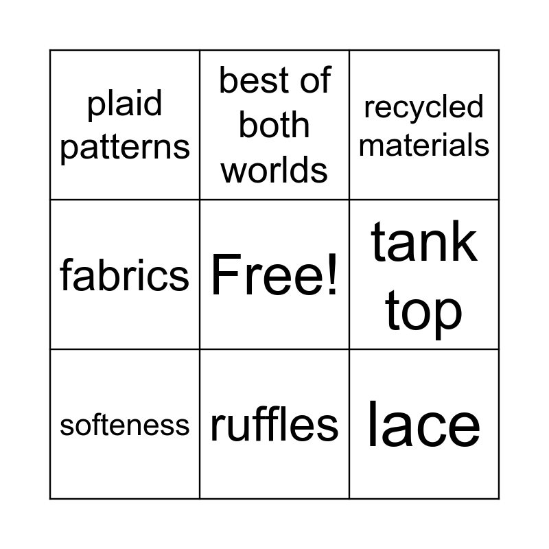 This bingo card has a free space and 8 words: tank top, recycled materials, best of both worlds, softeness, plaid patterns, lace, fabrics and ruffles.