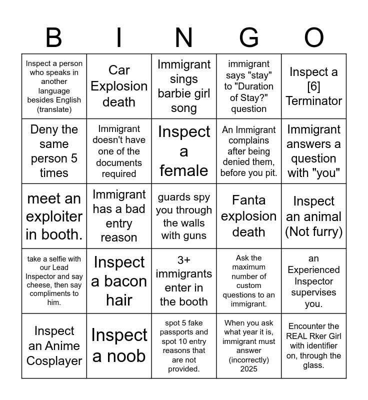 This bingo card has a free space and 24 words: Inspect a bacon hair, Inspect a noob, Inspect a female, Inspect an Anime Cosplayer, Inspect a [6] Terminator, Inspect a person who speaks in another language besides English (translate), Deny the same person 5 times, Car Explosion death, Fanta explosion death, 3+ immigrants enter in the booth, An Immigrant complains after being denied them, before you pit., meet an exploiter in booth., Ask the maximum number of custom questions to an immigrant., an Experienced Inspector supervises you., Immigrant doesn't have one of the documents required, When you ask what year it is, immigrant must answer (incorrectly) 2025, Inspect an animal (Not furry), Immigrant sings barbie girl song, Immigrant answers a question with "you", Immigrant has a bad entry reason, Encounter the REAL Rker Girl with identifier on, through the glass., take a selfie with our Lead Inspector and say cheese, then say compliments to him., immigrant says "stay" to "Duration of Stay?" question and spot 5 fake passports and spot 10 entry reasons that are not provided..