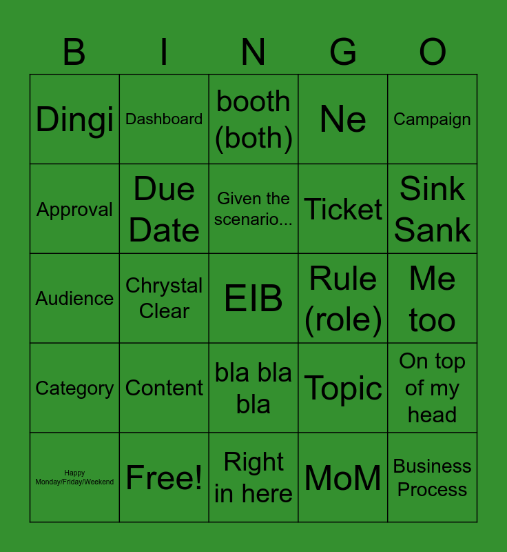 This bingo card has 30 words: Free!, I can understand it very well, Chrystal Clear, 100%, Dingi, booth (both), Due Date, bla bla bla, Rule (role), Right in here, Me too, EIB, MoM, Business Process, Sink Sank, Kurt, Topic, Category, Content, Campaign, Audience, Custom Report, Dashboard, Ticket, Approval, Ne, On top of my head, Happy Monday/Friday/Weekend, Given the scenario... and This is an old hand.
