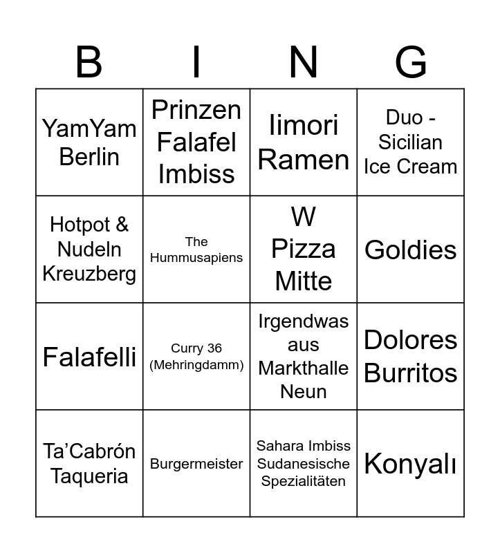 This bingo card has 16 words: Burgermeister, Dolores Burritos, Iimori Ramen, YamYam Berlin, Falafelli, Prinzen Falafel Imbiss, Irgendwas aus Markthalle Neun, Sahara Imbiss Sudanesische Spezialitäten, Hotpot & Nudeln Kreuzberg, The Hummusapiens, Ta’Cabrón Taqueria, Duo - Sicilian Ice Cream, Curry 36 (Mehringdamm), Goldies, W Pizza Mitte and Konyalı.