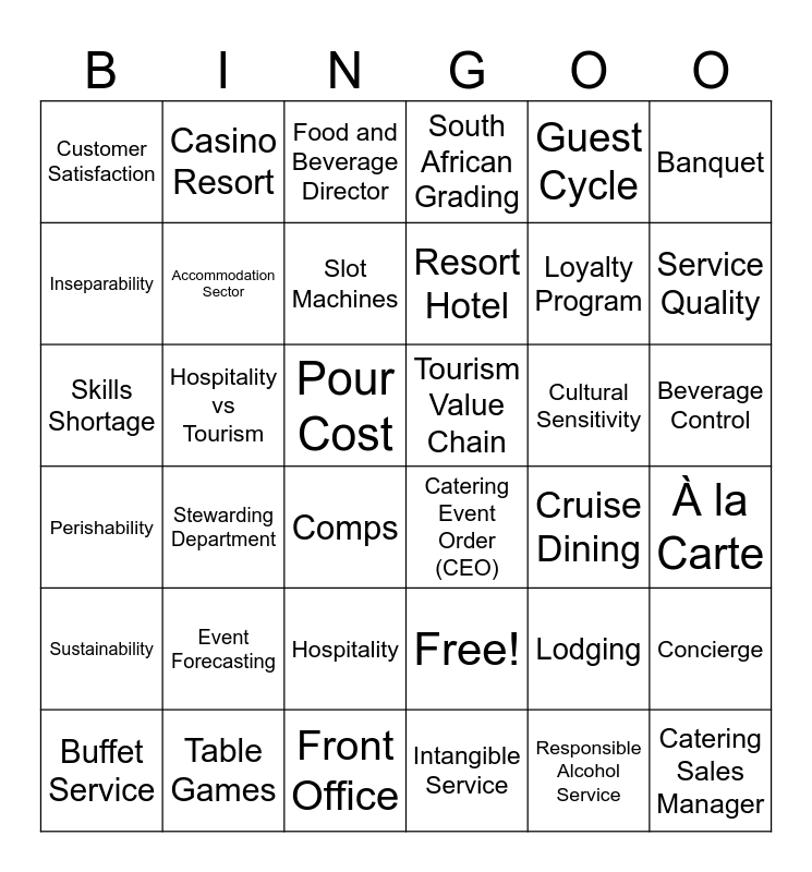 This bingo card has 36 words: Free!, Hospitality, Intangible Service, Inseparability, Perishability, Tourism Value Chain, Accommodation Sector, Front Office, Guest Cycle, Lodging, Service Quality, South African Grading, Concierge, Hospitality vs Tourism, Resort Hotel, Customer Satisfaction, Sustainability, Cultural Sensitivity, Skills Shortage, Food and Beverage Director, Pour Cost, Stewarding Department, Catering Event Order (CEO), Comps, Cruise Dining, Casino Resort, Loyalty Program, Table Games, Slot Machines, Banquet, Catering Sales Manager, Buffet Service, À la Carte, Beverage Control, Event Forecasting and Responsible Alcohol Service.