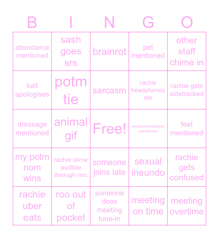 This bingo card has a free space and 24 words: rachie slime audible through mic, roo out of pocket, sarcasm, rachie uber eats, other staff chime in, attendance mentioned, kait apologises, sash goes srs, recommendations mentioned, someone joins late, rachie headphones die, dressage mentioned, sexual ineundo, rachie gets confused, potm tie, meeting on time, feet mentioned, brainrot, rachie gets sidetracked, animal gif, meeting overtime, my potm nom wins, pet mentioned and someone does meeting tune-in.