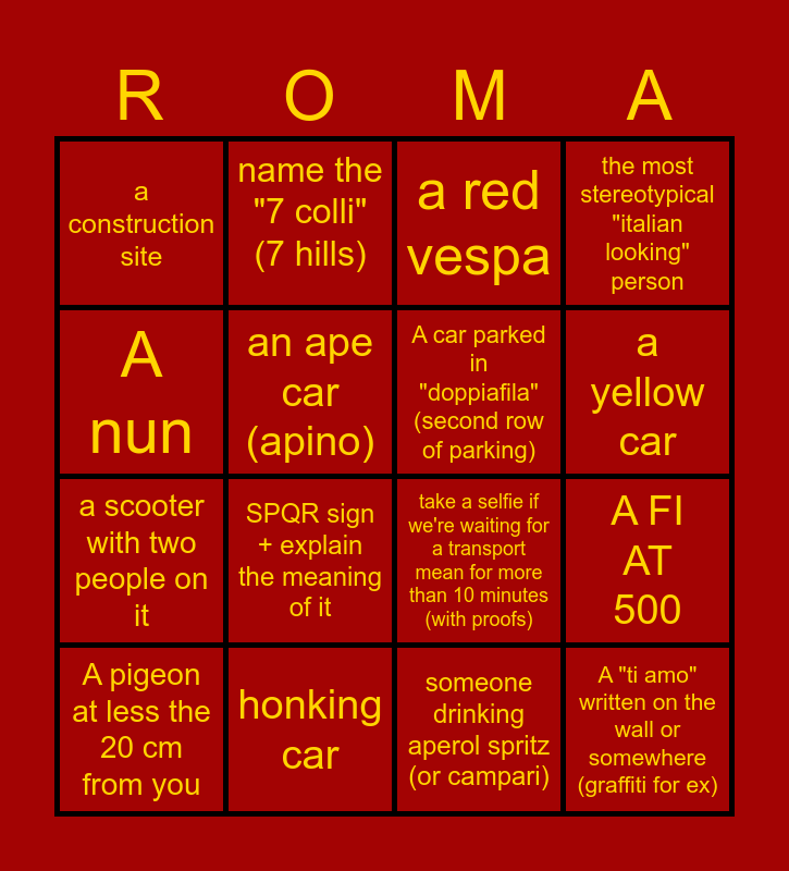 This bingo card has 32 words: A public drinking fountain, A ticket-guy for hop-on-hop-off busses, A FIAT 500, a tiny smart car, A "ti amo" written on the wall or somewhere (graffiti for ex), A car parked in "doppiafila" (second row of parking), A nun, someone with a paper map (we don't count, city pass doesn't count), name the "7 colli" (7 hills), an antique ruin, a yellow car, a red vespa, take the most stereotypical picture of rome, a tourist taking picture in a touristic place, honking car, a church, a street artist, take a selfie if we're waiting for a transport mean for more than 10 minutes (with proofs), Orgas doing orga stuff (not guiding the transfers), a cat, police men/military (at least 2 together), someone smoking iqos (specifically this brand), someone drinking aperol spritz (or campari), old person/ppl on a balcony, A pigeon at less the 20 cm from you, the most stereotypical "italian looking" person, a scooter with two people on it, an ape car (apino), a construction site, a picture showing the pope (calendars, magnets etc), A Roma and a Lazio flag and SPQR sign + explain the meaning of it.
