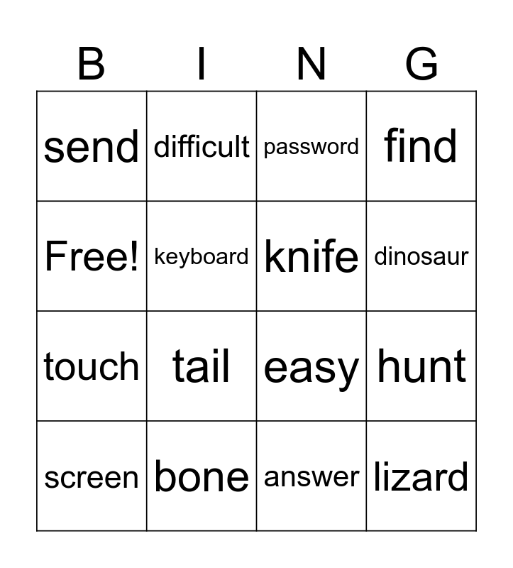 This bingo card has 16 words: bone, hunt, password, send, touch, difficult, easy, answer, Free!, keyboard, screen, find, tail, dinosaur, knife and lizard.