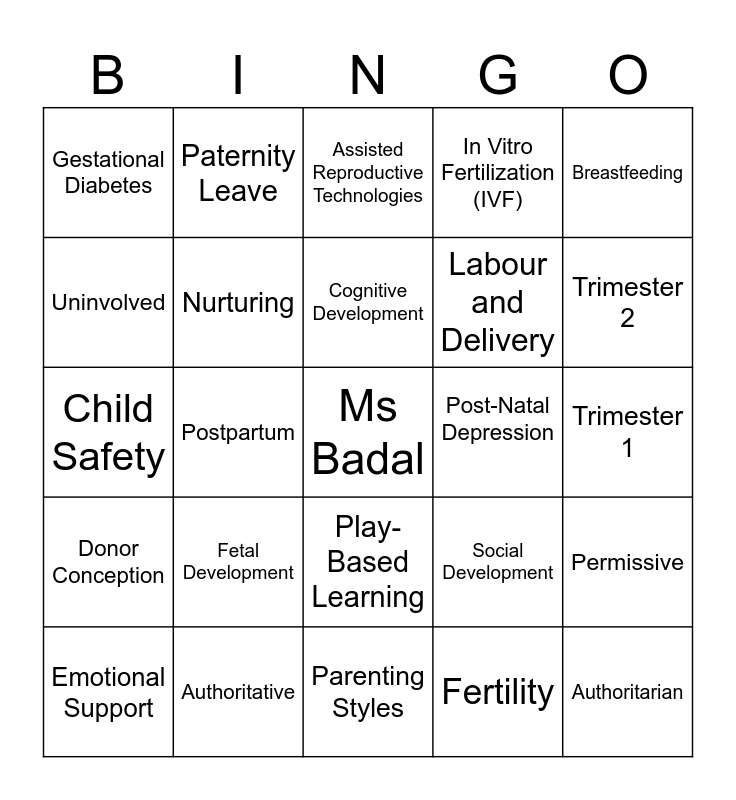 This bingo card has a free space and 25 words: Fetal Development, Parenting Styles, Cognitive Development, Emotional Support, Breastfeeding, Gestational Diabetes, Uninvolved, Paternity Leave, Post-Natal Depression, Play-Based Learning, Labour and Delivery, Child Safety, Social Development, Permissive, Nurturing, Pregnancy Trimesters, Trimester 1, Assisted Reproductive Technologies, Trimester 2, Postpartum, Authoritarian, Authoritative, Donor Conception, In Vitro Fertilization (IVF) and Fertility.