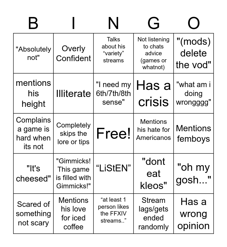 This bingo card has a free space and 24 words: "Gimmicks! This game is filled with Gimmicks!", Mentions his love for iced coffee, "I need my 6th/7th/8th sense", Scared of something not scary, "(mods) delete the vod", "Absolutely not", mentions his height, Overly Confident, Mentions his hate for Americanos, “LiStEN”, Has a crisis, Complains a game is hard when its not, "dont eat kleos", "oh my gosh...", Illiterate, Stream lags/gets ended randomly, Mentions femboys, Talks about his “variety” streams, "what am i doing wrongggg", Completely skips the lore or tips, Has a wrong opinion, "It's cheesed", Not listening to chats advice (games or whatnot) and “at least 1 person likes the FFXIV streams..”.