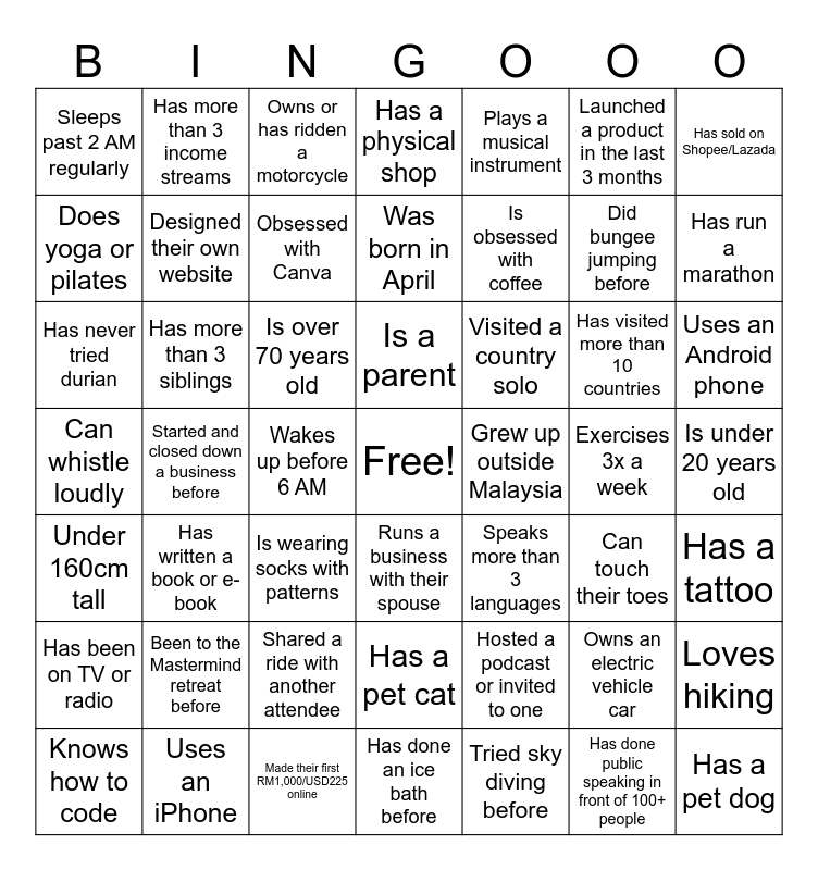 This bingo card has a free space and 49 words: Owns an electric vehicle car, Did bungee jumping before, Tried sky diving before, Started and closed down a business before, Is over 70 years old, Is under 20 years old, Has more than 3 income streams, Made their first RM1,000/USD225 online, Launched a product in the last 3 months, Runs a business with their spouse, Has sold on Shopee/Lazada, Has a physical shop, Has visited more than 10 countries, Visited a country solo, Been to the Mastermind retreat before, Exercises 3x a week, Does yoga or pilates, Has run a marathon, Loves hiking, Plays a musical instrument, Is obsessed with coffee, Wakes up before 6 AM, Sleeps past 2 AM regularly, Designed their own website, Knows how to code, Obsessed with Canva, Uses an Android phone, Uses an iPhone, Is a parent, Has more than 3 siblings, Is the eldest child, Grew up outside Malaysia, Has been on TV or radio, Shared a ride with another attendee, Can whistle loudly, Speaks more than 3 languages, Can touch their toes, Has a tattoo, Has never tried durian, Is wearing socks with patterns, Has a pet cat, Under 160cm tall, Has a pet dog, Has done an ice bath before, Was born in April, Owns or has ridden a motorcycle, Hosted a podcast or invited to one, Has written a book or e-book and Has done public speaking in front of 100+ people.