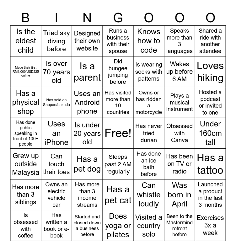 This bingo card has a free space and 49 words: Was born in April, Wakes up before 6 AM, Visited a country solo, Uses an iPhone, Uses an Android phone, Under 160cm tall, Tried sky diving before, Started and closed down a business before, Speaks more than 3 languages, Sleeps past 2 AM regularly, Shared a ride with another attendee, Runs a business with their spouse, Plays a musical instrument, Owns or has ridden a motorcycle, Owns an electric vehicle car, Obsessed with Canva, Made their first RM1,000/USD225 online, Loves hiking, Launched a product in the last 3 months, Knows how to code, Is wearing socks with patterns, Is under 20 years old, Is the eldest child, Is over 70 years old, Is obsessed with coffee, Is a parent, Hosted a podcast or invited to one, Has written a book or e-book, Has visited more than 10 countries, Has sold on Shopee/Lazada, Has run a marathon, Has never tried durian, Has more than 3 siblings, Has more than 3 income streams, Has done public speaking in front of 100+ people, Has done an ice bath before, Has been on TV or radio, Has a tattoo, Has a physical shop, Has a pet dog, Has a pet cat, Grew up outside Malaysia, Exercises 3x a week, Does yoga or pilates, Did bungee jumping before, Designed their own website, Can whistle loudly, Can touch their toes and Been to the Mastermind retreat before.
